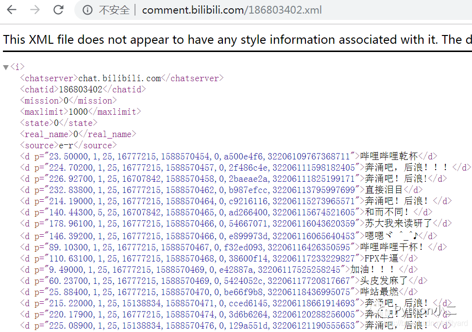 拿到了 cid,我们可以知道弹幕文件链接为:http://comment.bilibili.com/186803402.xml,打开链接看一下: